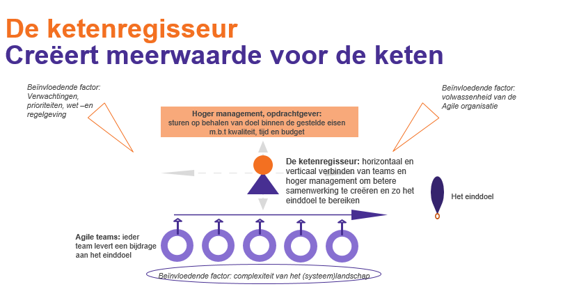Een ketenregisseur kan hier een brug slaan door met input van de Agile teams tot een scenarioplanning te komen, op basis waarvan het hoger management kan sturen. De ketenregisseur faciliteert het team- en project overstijgend werken en wordt hierin ondersteund door inhoudelijke experts.