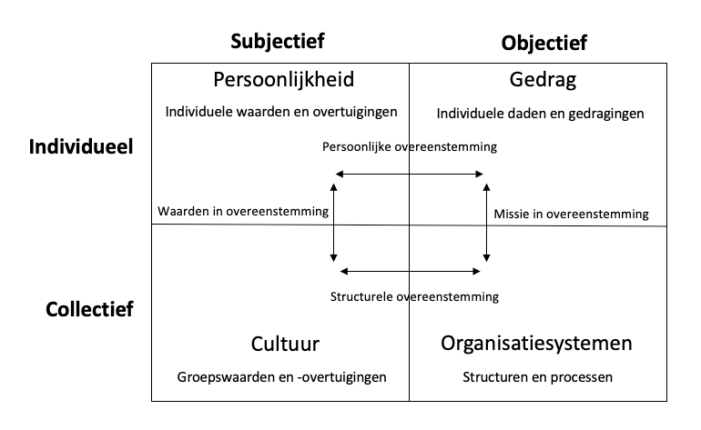 Het gedrag van medewerkers (rechtsboven) en de organisatiesystemen (rechtsonder) kunnen worden ingedeeld in de eerdergenoemde objectieve dimensie. Dit zijn de kwadranten die in de eerste instantie opvallen; je kunt het medewerkers en afdelingen zien doen. Attitudes en overtuigingen van medewerkers (linksboven) en de organisatiecultuur (linksonder) kan je niet meteen zien en vallen daarom onder de subjectieve dimensie. De kwadranten beïnvloeden elkaar en hebben onderlinge samenhang.
