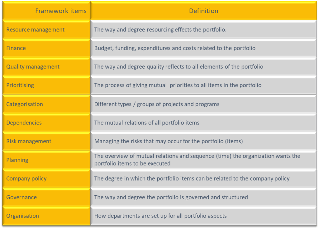 Eerder is aangegeven dat het inzicht in de volwassenheid van je organisatie essentieel is bij het planmatig doorvoeren van verbeteringen. Dat inzicht kan in principe worden verkregen bij ieder soort organisatie op ieder niveau én in iedere fase van ontwikkeling. Met behulp van het POrtfolio Maturity Model (POMM) kan een volwassenheidsmeting worden uitgevoerd. Het model is gebaseerd op het onderstaande framework. De wijze waarop men aan de onderstaande aandachtsgebieden (framework items) in de praktijk invulling geeft, bepaalt de volwassenheid van het portfoliomanagement van de organisatie.
