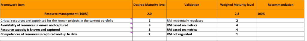 We hopen en verwachten het natuurlijk niet, maar stel dat het proces van Resource Management niet gereguleerd is binnen (een deel van) uw organisatie, dan is validatieregel 1 (RM not regulated) van toepassing. Hetgeen neerkomt op een kwalificatie (althans voor Resource Management) van volwassenheidsniveau 1 (Initial). Voor ieder van de 11 aandachtsgebieden in het framework is een 5-tal validatieregels gedefinieerd die ieder op zich verwijzen naar een van de 5 volwassenheidsniveaus. Door alle validatieregels te scoren komt er uiteindelijk inzicht in het niveau tussen de 1 en 5. In de meeste van de geteste organisaties ligt het gemeten niveau tussen 1.5 en 2.4 en is het gemeten niveau lager dan het gewenste niveau.