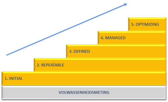 Omdat we graag een indruk willen krijgen van de volwassenheid en de professionaliteit binnen deze aandachtsgebieden worden de vijf niveaus van volwassenheid afgebeeld op deze aandachtsgebieden. Dat betekent dat er per niveau van volwassenheid vereisten zijn waar een proces als bijvoorbeeld Resourcemanagement aan zou moeten voldoen (zie verderop het uitgewerkte voorbeeld).